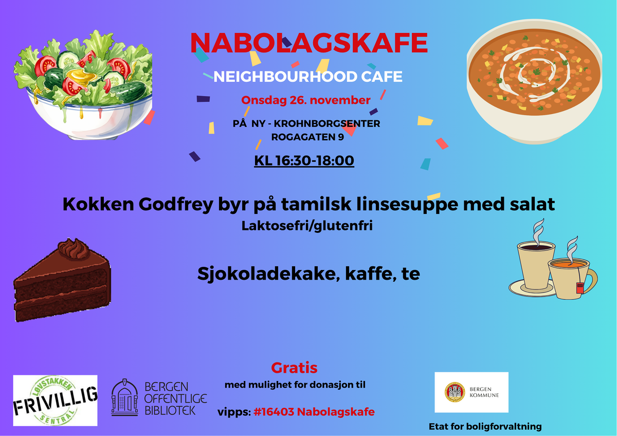 Velkommen til nabolagskafe på Ny-Krohnborgsenter onsdag 26. november kl 16.30-18.00. Kokken Godfrey serverer nydelig tamilsk linsesuppe med salat. Sjokoladekake til dessert. Biblioteket har åpent slik at du kan sette deg inn der etter måltidet og slappe av med en god bok og en kopp kaffe, eller finne fram kunstneren i deg og tegne.
